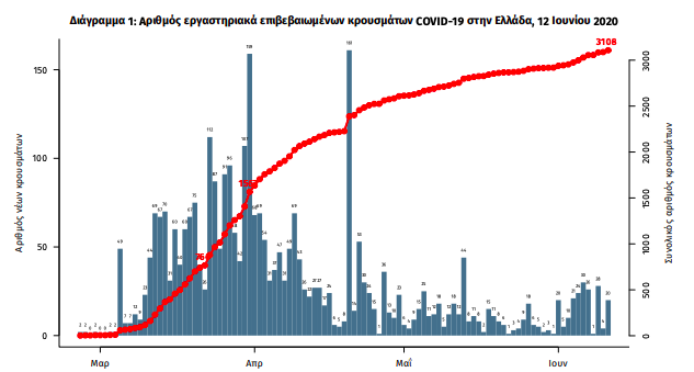Συγκεκριμένα, όπως ανακοινώθηκε από τον ΕΟΔΥ, 20 είναι τα νέα κρούσματα του νέου ιού στη χώρα. Ο συνολικός αριθμός των κρουσμάτων είναι 3108, εκ των οποίων το 55.0% αφορά άνδρες.