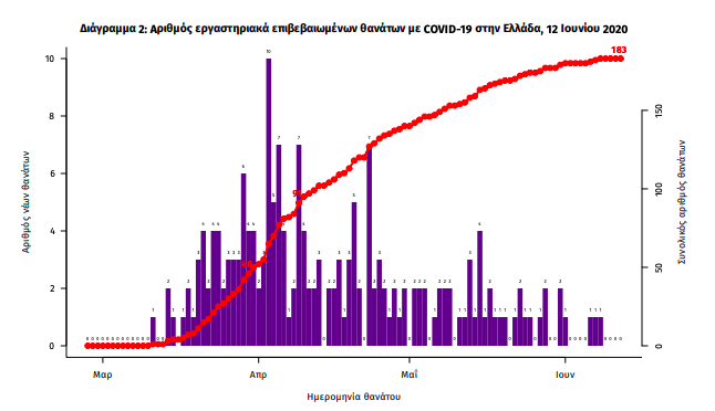 Τέλος, δεν έχει καταγραφεί κανένας νέος θάνατος, ενώ έχουμε 183 θανάτους συνολικά στη χώρα. 56 (30.6%) γυναίκες και οι υπόλοιποι άνδρες. Η διάμεση ηλικία των θανόντων συμπολιτών μας ήταν τα 76 έτη και το 95.6% είχε κάποιο υποκείμενο νόσημα ή/και ηλικία 70 ετών και άνω.