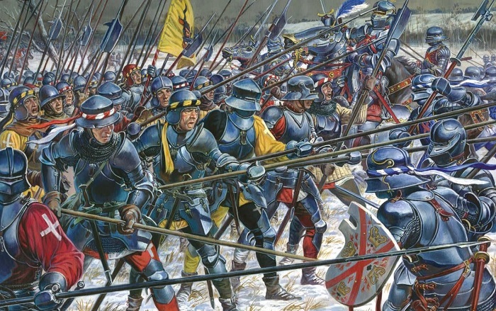 Κατέκοψαν το εχθρικό ιππικό που έσπασε στον “γρανιτενιο” Ελβετικό βράχο και συνέχισαν την προέλαση, “βγάζοντας τα βέλη από τις βαλλιστρες από το σώμα τους συνεχίζοντας την μάχη, ακόμα και όταν είχαν κατακοπει από τους αντιπάλους και ειχαν μείνει χωρίς χέρια” , σύμφωνα με τον Αινεία Σίλβιους (μετέπειτα Πάπα Πιο Β’).